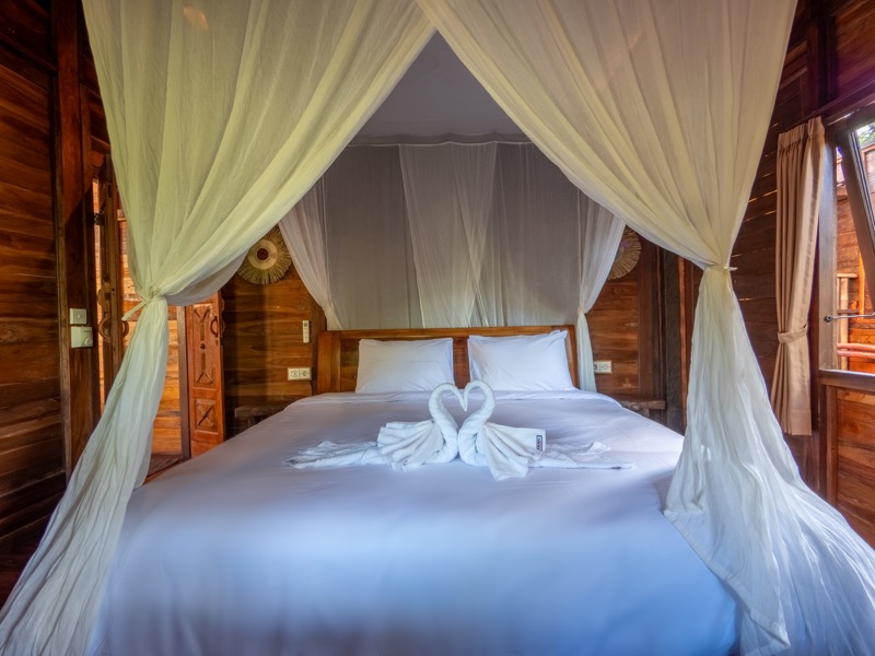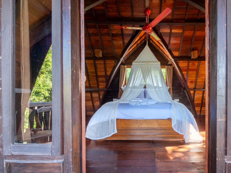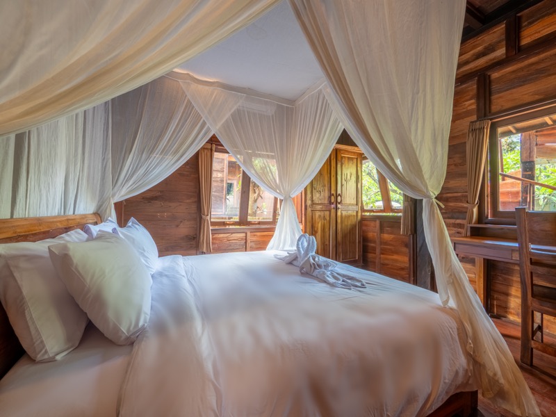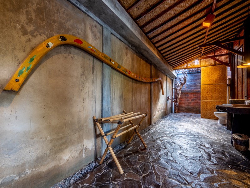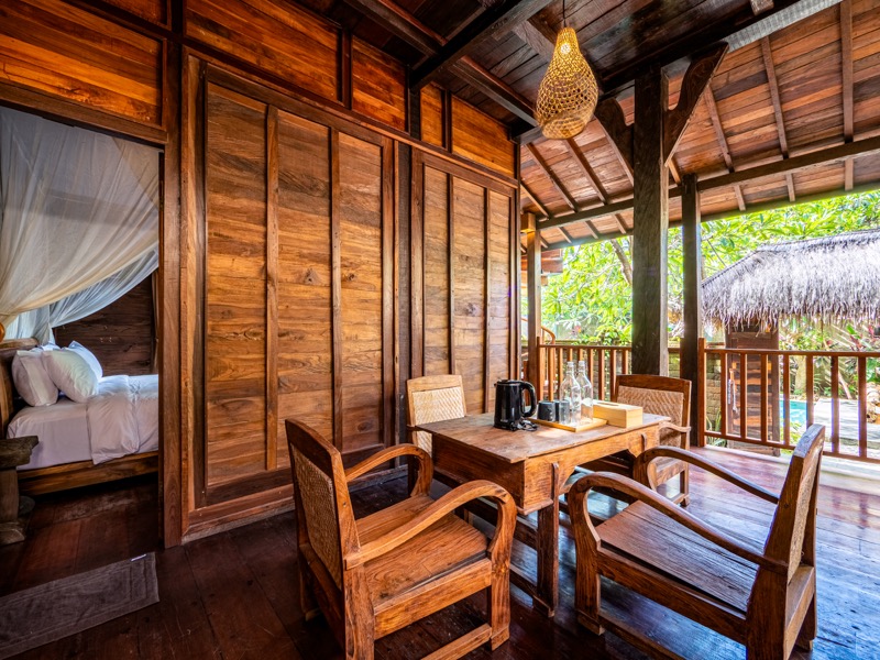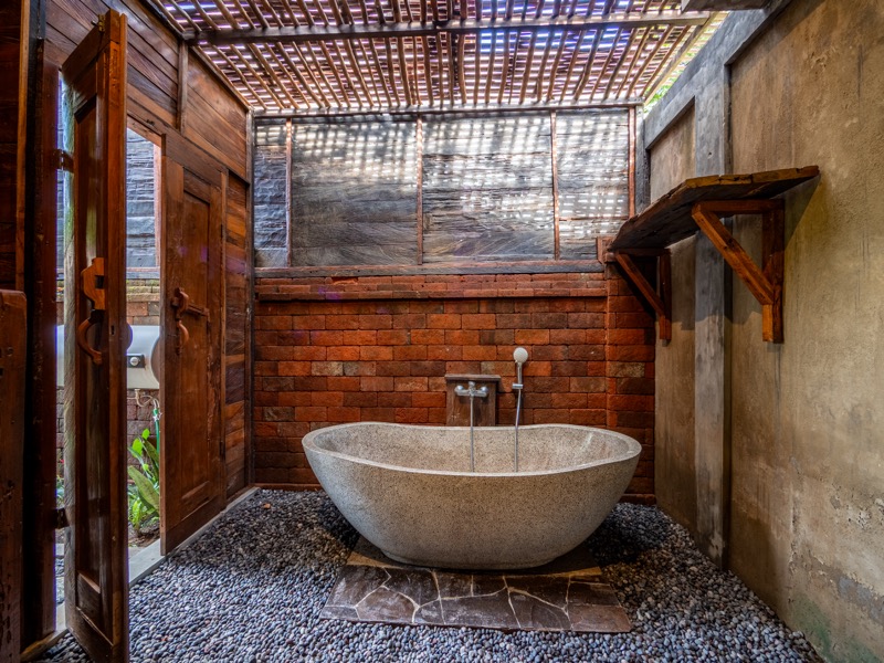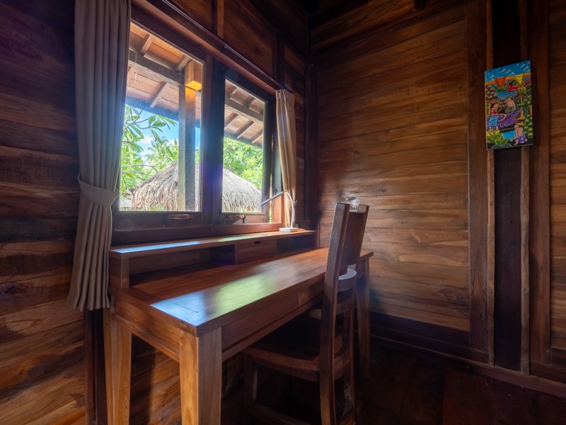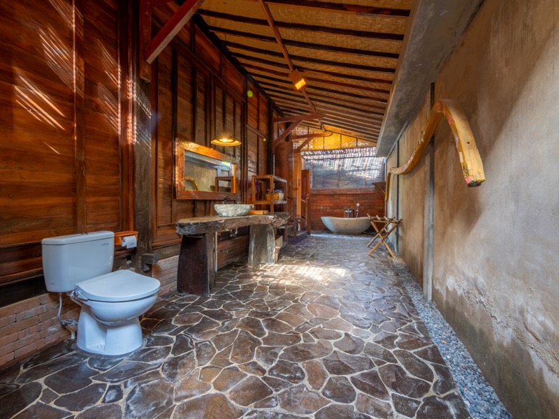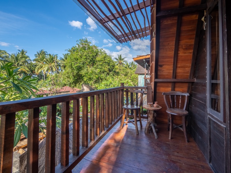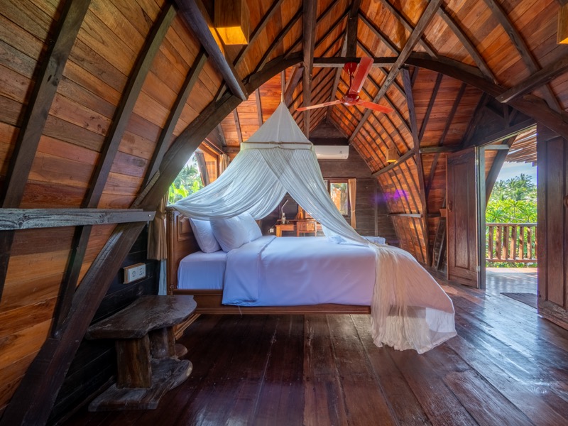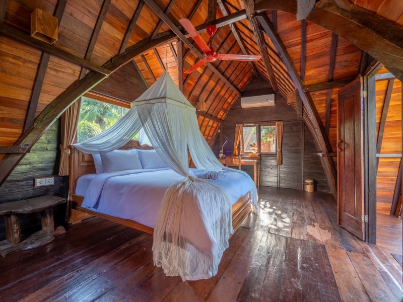 The upper room offers a tranquil hideaway with gentle breezes and soft natural light, while the lower bedroom invites restful nights surrounded by the calming sounds of nature. A welcoming open-air lounge and dining area complete the villa, offering a perfect setting for leisurely breakfasts or quiet afternoon moments beneath the trees. At Nirmala, every detail is crafted to create a warm, soulful escape where simplicity meets serene island living.